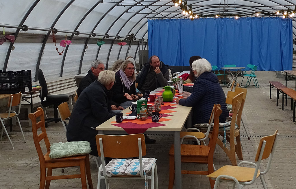 Zum gemütlichen Abschluss saßen wir bei Kaffee und Kuchen im Pausen-Gewächshaus der Solawi und kamen ins Gespräch – über Glauben, Kloster, Gemüse und Solawi-Organisation.