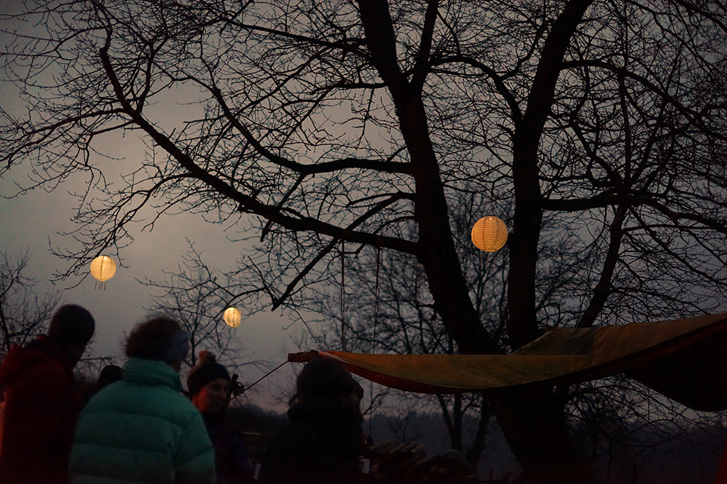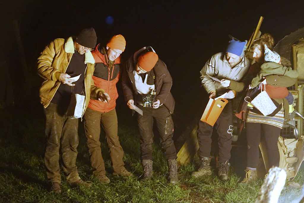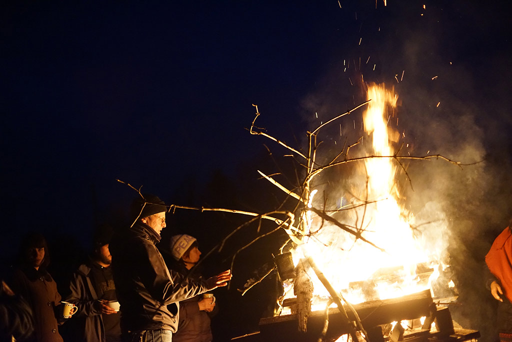 Es wird gelacht, erzählt und beobachtet. Manche bleiben dicht am Feuer, andere wechseln zwischen Sauna, Stall und Lagerplatz. Ruths Räucher-Ritual zur Wintersonnwende bildet einen ruhigen Moment im Trubel. Ein Teil der Gruppe begleitet das Ritual hinaus über die Felder, andere bleiben am Feuer und genießen die gemeinsame Zeit.