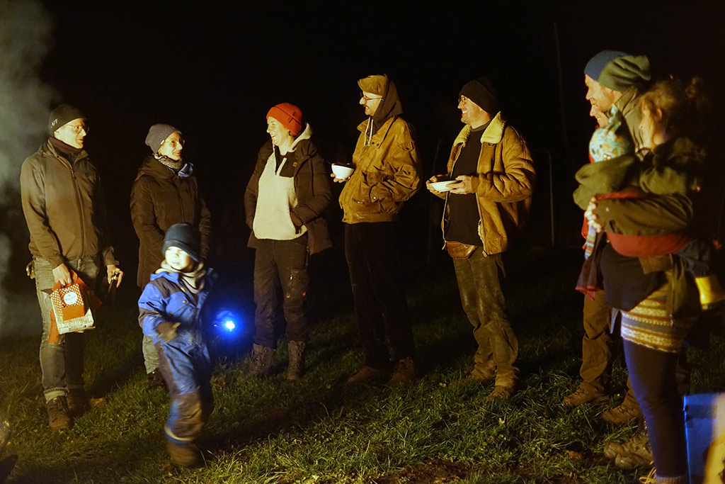 Am 21. Dezember kommen wir auf dem Hof zusammen – so viele wie selten zuvor zu einer Wintersonnwendfeier. Rund 60 Menschen finden an diesem dunklen, kalten Abend den Weg zu uns. Die längste Nacht des Jahres zeigt sich von ihrer geselligen Seite: Feuer, Wärme, Gespräche und gemeinsames Innehalten prägen den Abend.