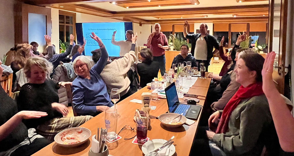 Besonders interessant war auch der Rückblick aufs vergangene Gartenjahr durch Miguel. Der Frühling 2025 zeigte sich lange kühl, was vor allem dem Fruchtgemüse zu schaffen machte. Trotzdem wurde auf dem Acker unglaublich viel gemeinsam geschafft. Vor allem die Kartoffel- und Kürbisernte fiel dank guter Witterung sehr erfreulich aus. Durch die begleitenden Fotozusammenfassung des vergangenen Jahres wurden die schönsten Momente etwa von den Aktionstagen oder auch von verschiedenen Festen nochmal für alle Mitglieder greifbar.