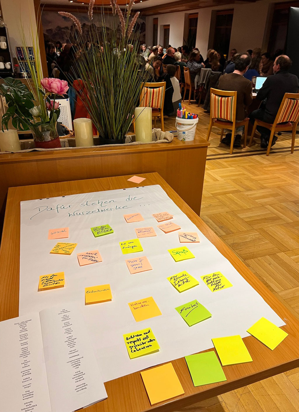 Zum Abschluss wurde noch über anstehende Projekte, Ressorts und das entstehende Leitbild der Wurzelwerke gesprochen. Im Mittelpunkt stehen weiterhin das, was unsere Solawi ausmacht: gutes Gemüse, kurze Wege, solidarisches Wirtschaften und vor allem eine lebendige Gemeinschaft. Für das Leitbild der Vereinten Wurzelwerke war letztere dann direkt gefragt. So konnten alle Mitglieder für den Mit-Mach-Teil des Schriftwerks auf Post-Ist verewigen, mit welchen Werten sie die Solawi verbinden.